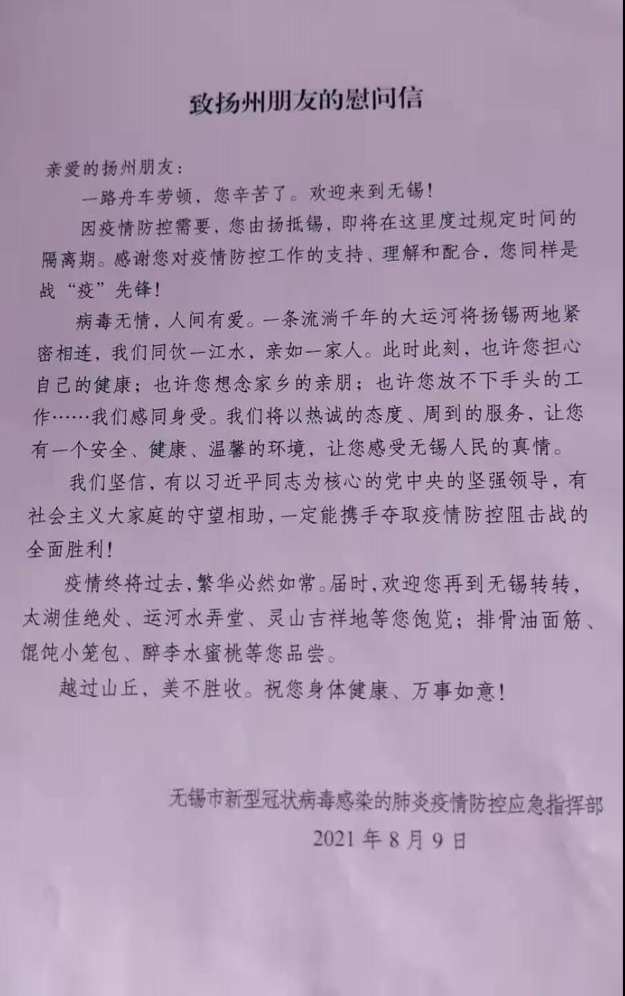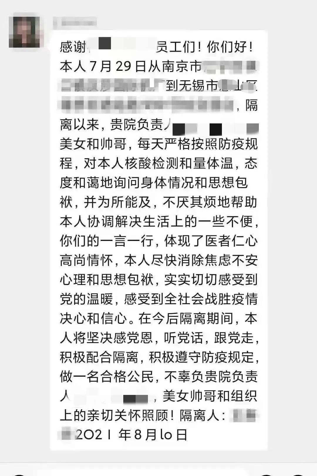 隔离人员 卞女士:“酒店干净卫生,配套设施齐全,房间里一应俱全,我们住得非常舒适。感谢无锡政府和无锡人民!”