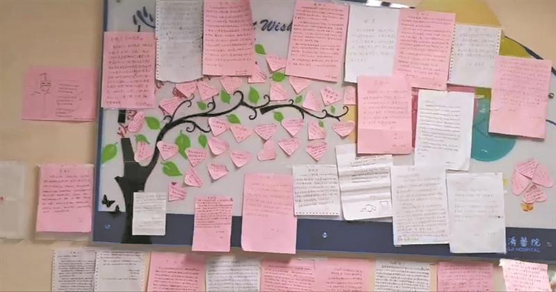 在病区的墙上,密密麻麻贴满了出院病人的感谢信。(照片由无锡援湖北医疗队提供)