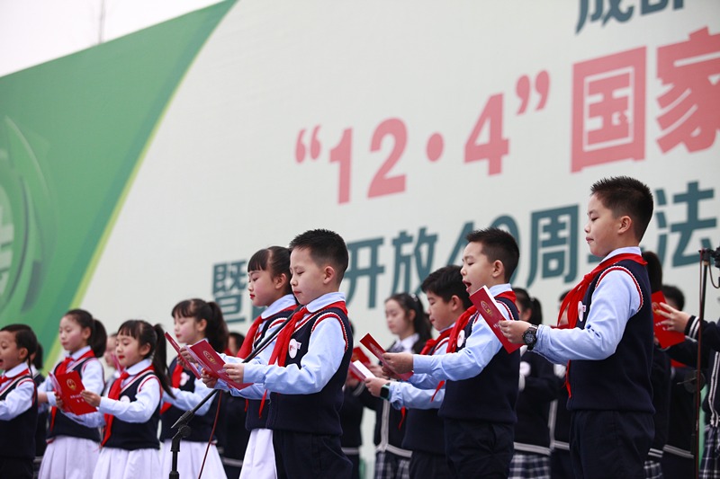 成都市2018年“12·4”国家宪法日活动现场,小学生朗读宪法。