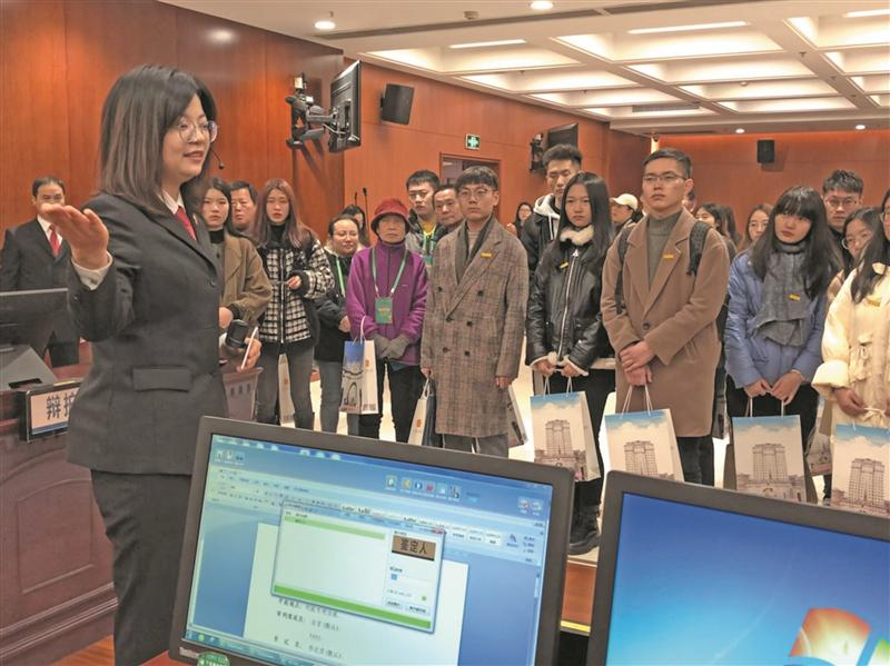 据介绍,目前法院引入了多种智能化的设备,在诉讼的方方面面为诉讼人提供便捷的服务。在法庭内,工作人员介绍了法庭的功能、布局和智能化的设备。从最早靠人力笔录,到后来的电脑打字,现在的语音录入,庭审的设备经过了多次更新,也让庭审的效率大大提升。现场,一些代表也坐上了审判长、公诉人的座位,过了一把当法官的瘾。