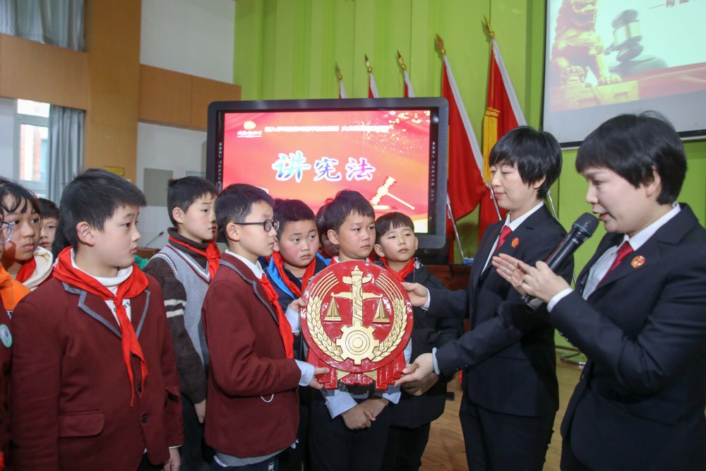 △2020年12月1日,安徽省合肥市滨湖人民法庭的法官走进校园,向学生们展示法徽,介绍其由来及背后的故事。