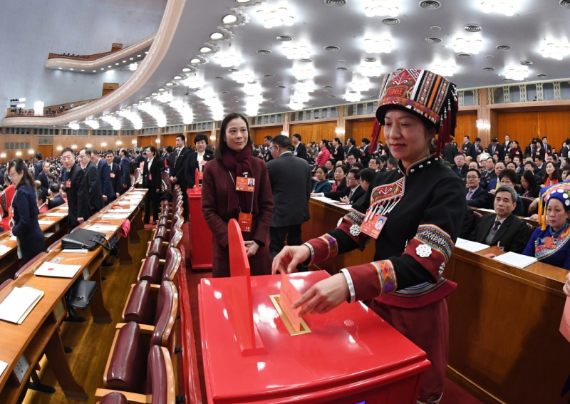 △2018年3月11日,在十三届全国人大一次会议第三次全体会议上,代表们在投票表决《中华人民共和国宪法修正案(草案)》。
