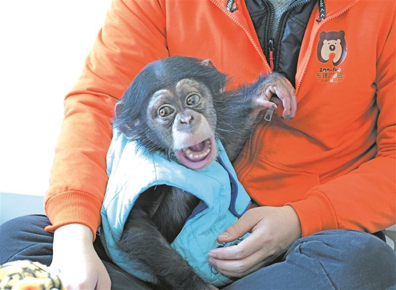 看完农场的牛后,游客还能移步游览黑猩猩的家。黑猩猩宝宝妞宝(又名满满)已20个月了,自一岁多进行人工饲养后,便与饲养员尤师傅亲密起来。牛年春节即将到来,尤师傅为妞宝准备了满满的年货以及一份新年礼盒:苹果、香蕉、提子、花菜、橙子、花生、瓜子、龟粮、青草、牛肉等食材以及一瓶奶粉。胆小的黑猩猩宝宝对于首次看到的食物充满了好奇,抱着尤师傅,既害羞又充满探索欲。
