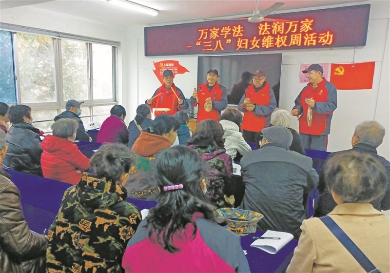 昨天(3月1日),江海街道顺和里社区妇联邀请弘法志愿服务团开展以“万家学法 法润万家”为主题妇女维权周活动,结合《民法典》相关内容,将社会普遍关心的权益保护、法律救济、平等就业等内容自编自导成小节目,现场进行演绎普及,积极推进平安家庭建设。(朱吉鹏 摄)