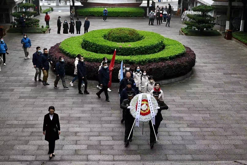 澎湃新闻党委“初心之路”临时党支部成员在井冈山革命烈士陵园向革命先烈敬献花圈。