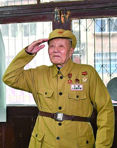 张富清穿着老式军装敬军礼。新华社记者程敏摄