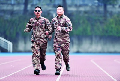 杜富国(左)和战友在跑步。(资料图片)新华社记者王全超摄