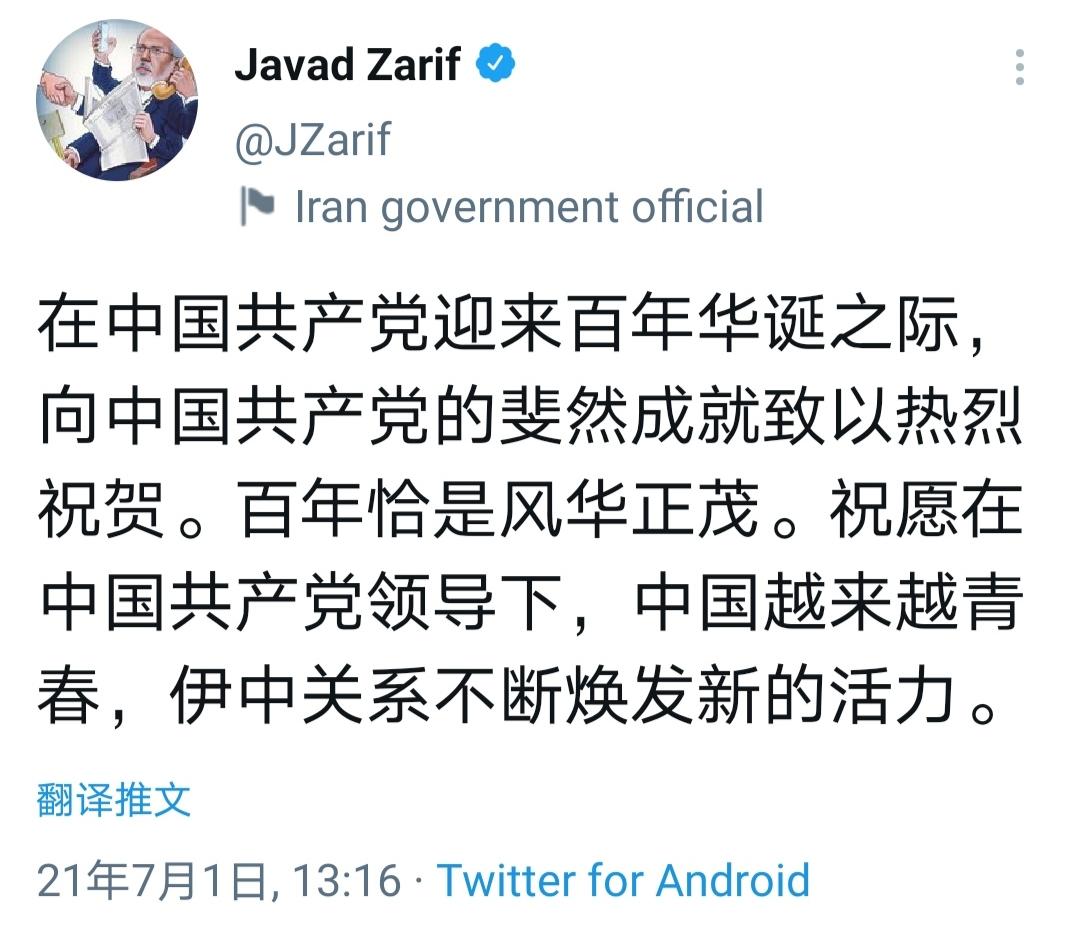 伊朗外长扎里夫祝贺中国共产党百年华诞