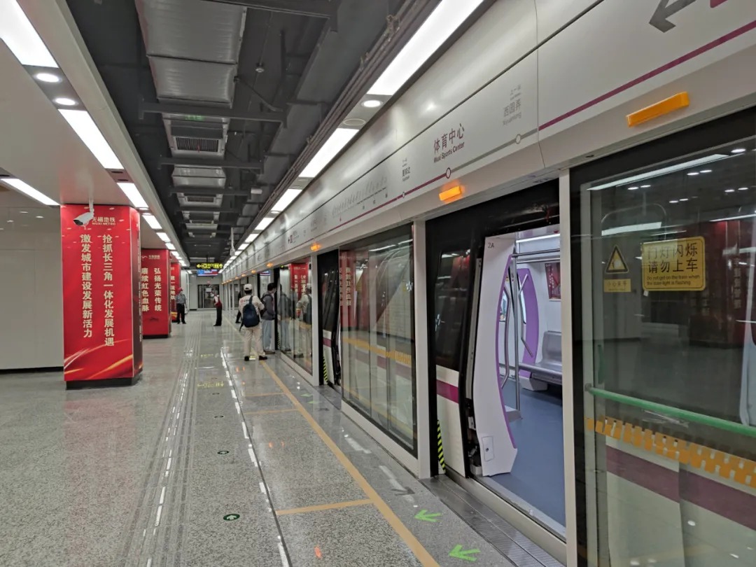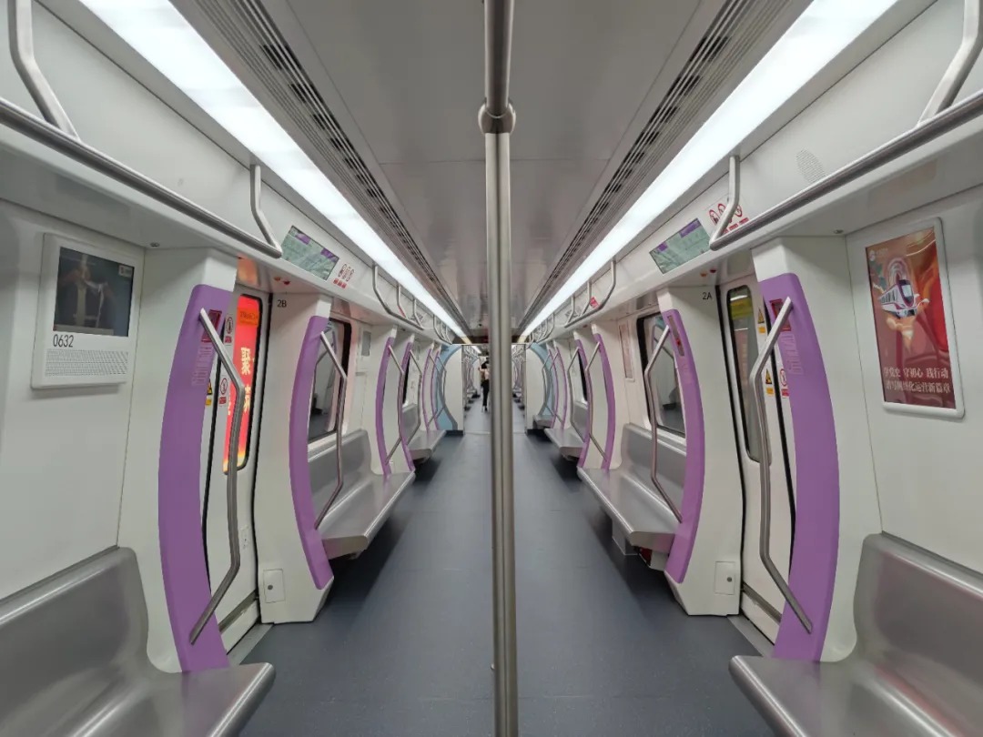 走进车厢,多处细节凸显了“阿紫”别具一格的设计。车厢门上方新增LCD动态地图设备,信息显示更丰富、画面更美观,乘客可明确看到列车前进方向及到站等信息,车厢连接处顶部的显示屏升级成高铁复兴号同款电子屏,更清晰美观;和1、2、3号线列车相比,“阿紫”还多了一项人性化设计:每节车厢都配备轮椅安全扣,轮椅固定后不会随车厢晃动;此外,每节车厢都采用“月亮门”主题,为整列车注入江南园林元素。