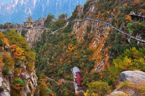 立于栈道,远处山坳,近处脚底,一株株,一团团,一簇簇,黄红相间,色彩缤纷,鲜艳夺目,仿佛进入了“车行十里画屏上,身走四方红叶中”的梦幻童话世界。