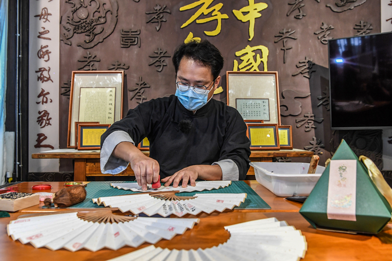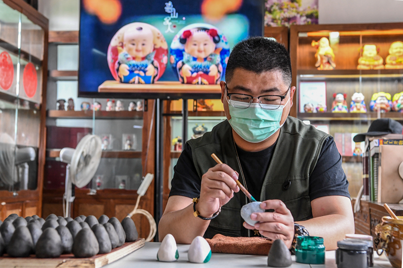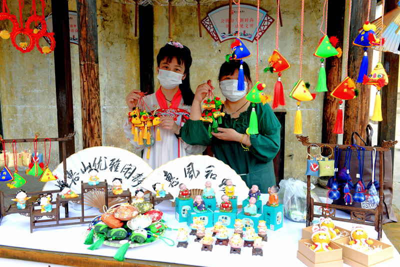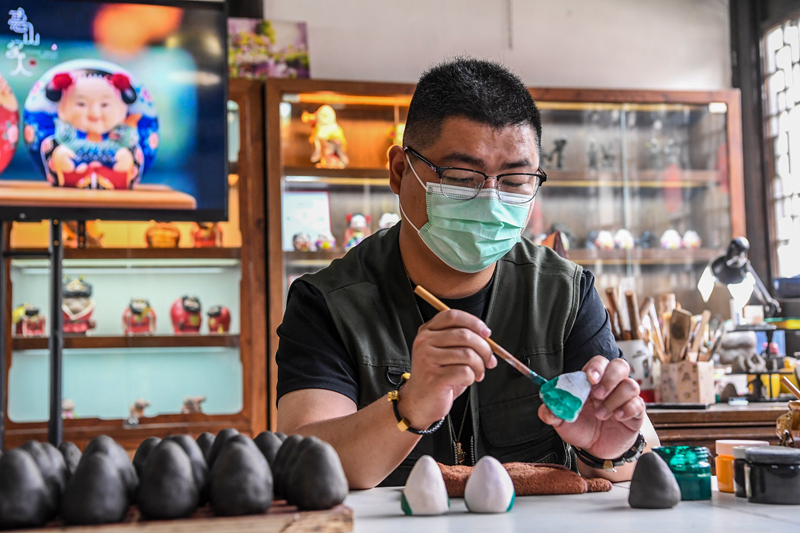 5月27日,工艺师在彩绘用泥制作的工艺品“福粽”。当天起,惠山古镇景区举办“倷伲惠山粽有情” 端午文化节,由工艺师开展工艺粽、状元扇、香囊制作等民俗表演,让游客品味厚重的吴地文化。(刘芳辉 摄)