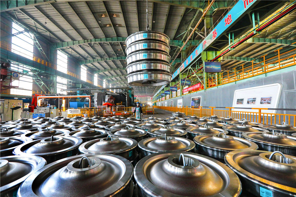 3月3日,在中国宝武马钢一车轮生产车间,成品车轮在吊装准备发货。新华社发
