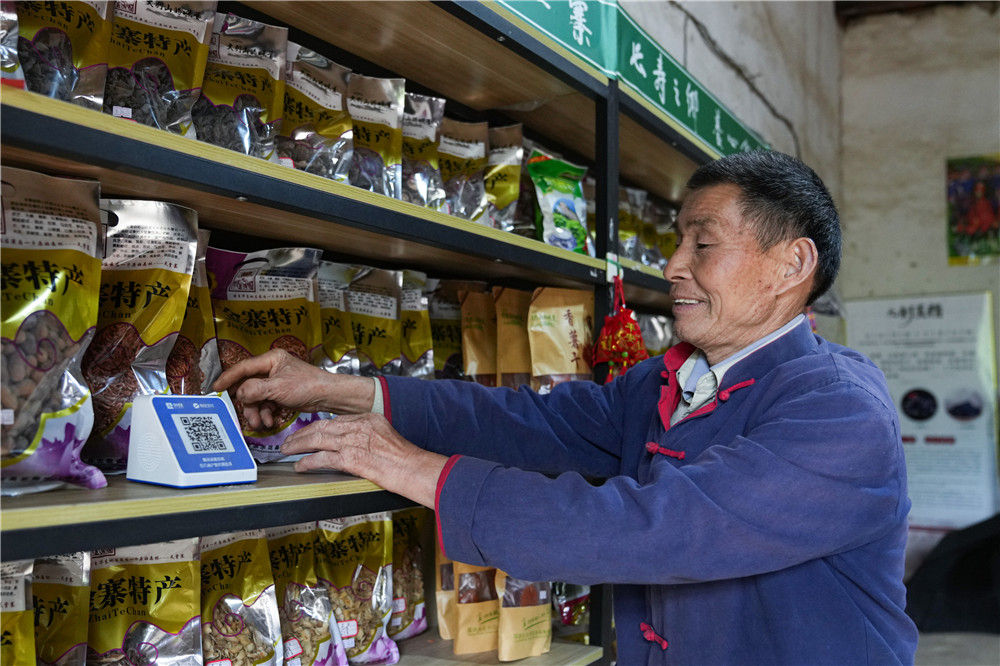 5月11日,安徽省金寨县花石乡大湾村村民陈泽申在整理货架,货架上码放着木耳、香芋干等当地特产。新华社记者 杜宇 摄