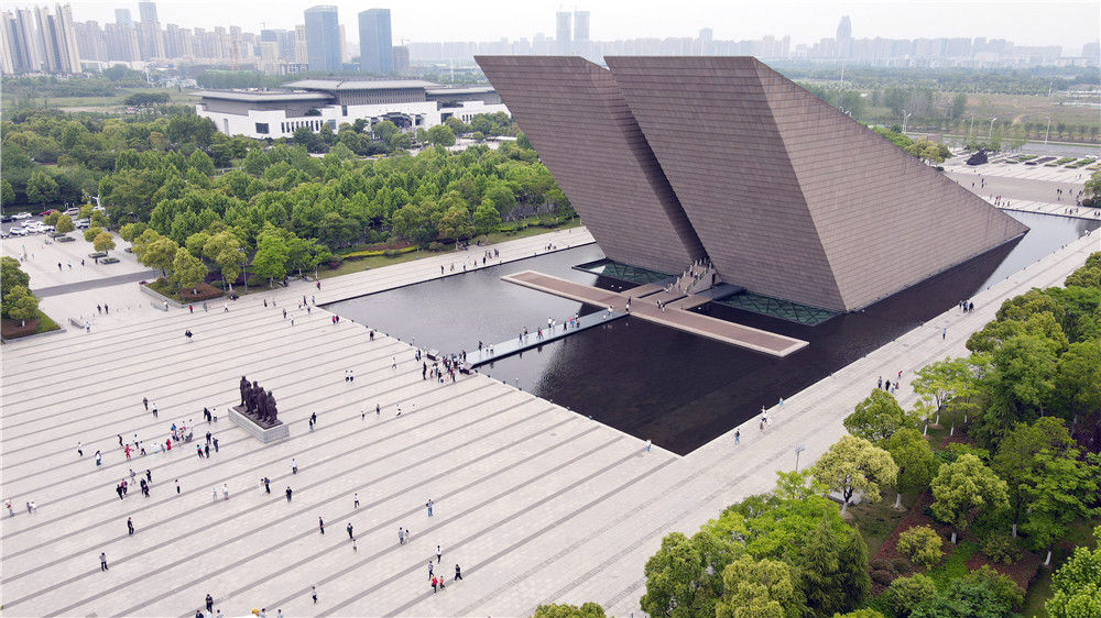 游客在渡江战役纪念馆参观游览(2021年5月3日摄,无人机照片)。新华社记者 周牧 摄