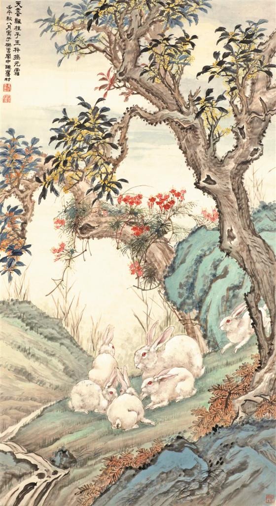 图中六只白兔踞于坡石之上,或伏身低首聚会,或灵动跳跃而来,眼睛晶莹通透,毛发柔软细腻。其后两棵桂树粗壮挺拔,簇簇金桂点缀于绿叶之中,枝叶掩映着一轮圆月。整作刻画细腻,设色妍雅,气氛恬静安详。