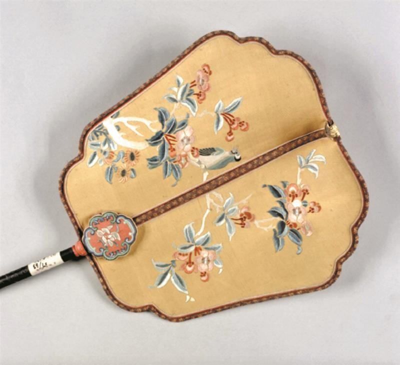 绸绣花鸟图面乌木嵌银丝柄团扇