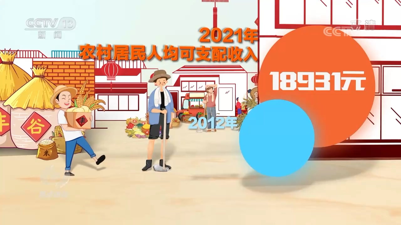 2021年,农村居民人均可支配收入18931元,比2012年翻了一番多,这背后是大力发展的乡村产业,每个脱贫县都打造了2-3个主导产业,产业振兴是乡村振兴的重中之重。从只卖农产品本身到不断增加附加值,我国农产品加工转化率达到了70.6%。越来越丰富的农产品通过网络卖到千家万户,农产品网络零售额超过4200亿元。与此同时,农村一二三产业不断融合,累计创建了140个优势特色产业集群、250个国家现代农业产业园,其中,乡村旅游产业每年营业收入也已经超过7000亿元。在这些产业的助力下,老乡们的小康生活,还在继续。