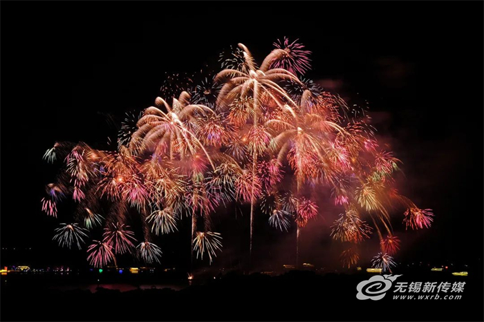 开场序曲之后,紧贴着湖面出现一个半圆形礼花,随后礼花跃过湖面,向高空渐次绽放,“湖上升明月”的创意呈现眼前。这是在迎接重返无锡的尊贵客人。