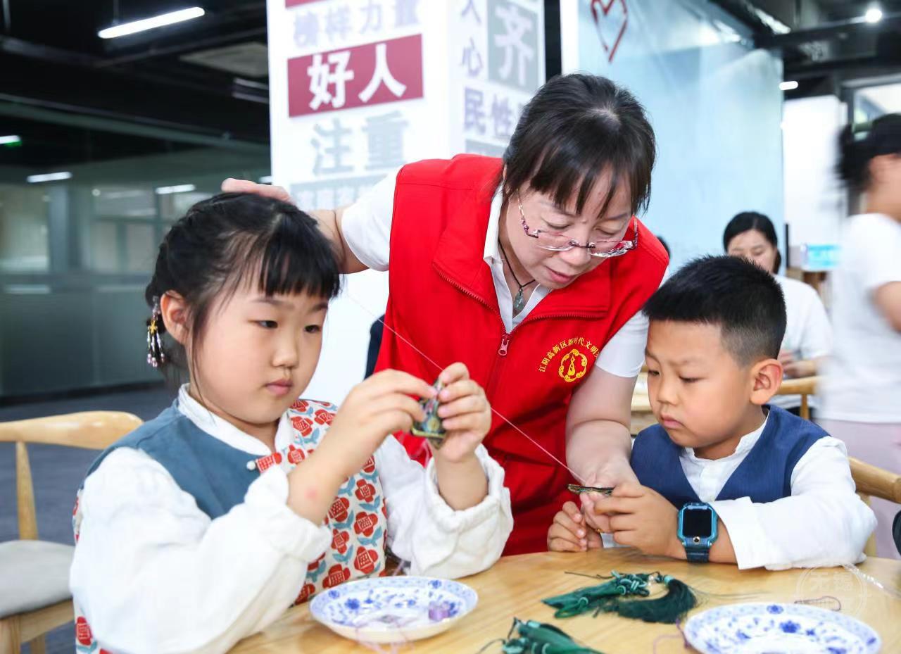 传承弘扬中华民族敬老孝亲的传统美德,观看完精彩的表演后,“一老一小”、“一家人”围坐一起,在志愿者的指导下,共同缝制茱萸香囊,以此感时序、忆旧时、念家乡、思亲朋、敬孝亲、祈安康。穿针、引线、填茱萸、缝制……整个制作过程有条不紊、充满趣味。香囊制作完成后,孩子们还给现场的长者送上了定制的重阳糕,大家一起品尝着重阳糕,讲解敬老节文化习俗,活动现场不时传来阵阵笑声。