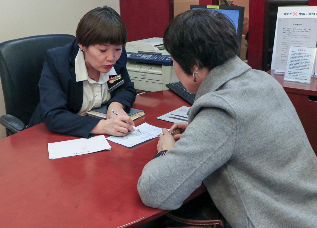 在中国工商银行新疆乌鲁木齐的一处营业网点,李鹏(左)为客户解答问题(2018年11月摄)。新华社发