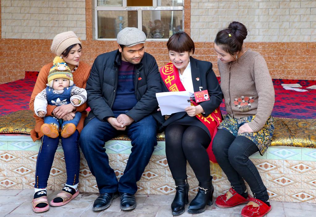 李鹏在新疆喀什地区疏勒县塔尕尔其乡塔尕尔其村向村民进行理论宣传(2017年12月摄)。新华社发