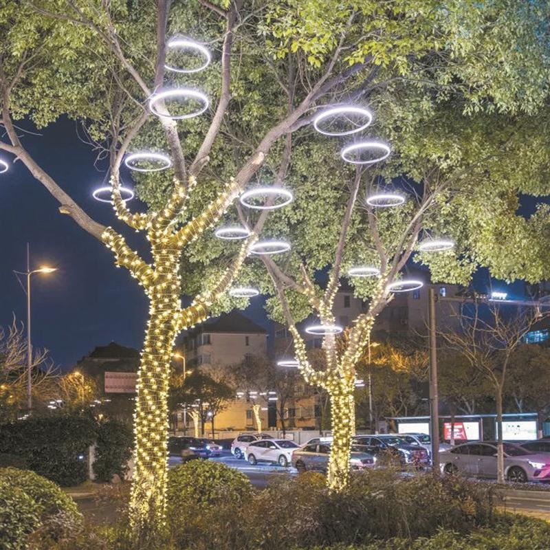 欢乐喜庆的新春气象,少不了璀璨绚烂的夜景烘托。当夜幕降临,驾车行驶在太湖大道,仿佛进入了一个流光溢彩的世界。只见道路两旁行道树披上了“华彩衣裳”,藤球灯、树环灯、雪花灯美丽绽放,形成光影相连的美好视觉体验,将节日氛围“顶格拉满”。作为今年春节亮化提升的重点道路,太湖大道共配置了7000余件发光灯饰,30处创意满满的灯光小品遍布各个路口,17余万米满天星串、3908套藤球灯、1640套树环灯,让576余棵行道树呈现出“火树银花”的景象,上演流光溢彩的新春美景。