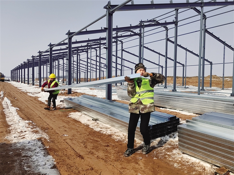 工人正在进行牛棚钢结构主体安装。张俊英摄