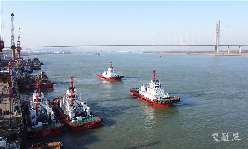 【镇江】1月16日,镇江高新区船舶和海工产业龙头企业江苏省镇江船厂(集团)有限公司同日交付自主设计并建造的5艘多功能全回转拖船,创企业单日交船数量新纪录。2022年以来,镇江船厂紧紧围绕单项冠军产品“中国第一”品牌,形成了混合动力、全电力推进等技术和产品储备,为2023年生产经营奠定坚实的基础。文雯 朱大智/摄 视觉江苏网供图
