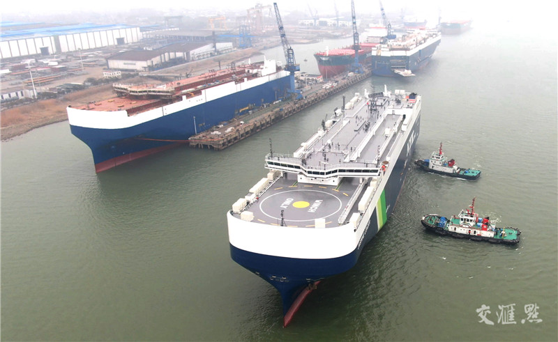 【扬州】2月8日,招商金陵船舶为日本邮船集团(NYK)建造的首艘LNG(液化天然气)动力7000车位汽车滚装船顺利交付。据了解,该船总长199米、型宽38米,拥有12层汽车甲板、4层活动甲板,具有装载7000车位能力,通过使用液化天然气燃料和多项环保技术,将减少99%的硫氧化物、86%的氮氧化物和50%的甲烷排放。杭云飞/摄 视觉江苏网供图