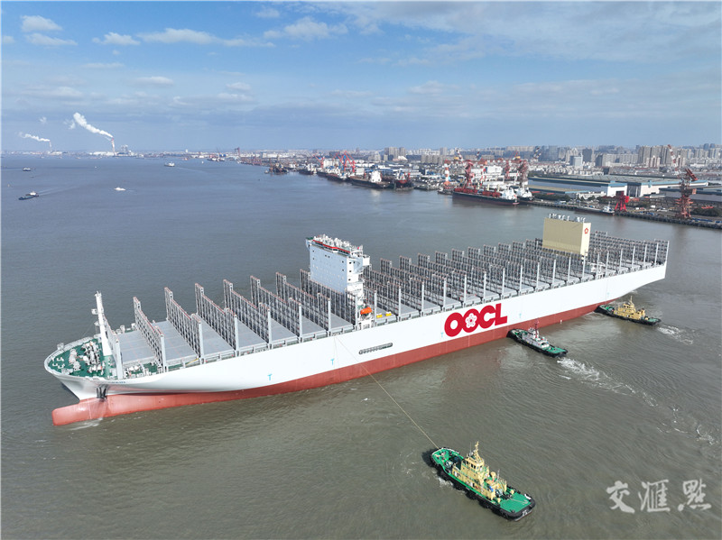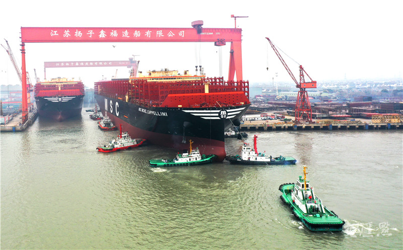 【泰州】2月17日,由江苏扬子江船业集团下属的江苏扬子鑫福造船有限公司建造的两艘全球最大集装箱船同时在泰州出坞。该型船装箱量最多达24346标准箱,总长399.9米、型宽61.3米,最大堆箱层数可达25层,相当于22层楼的高度。夏纪福/摄 视觉江苏网供图