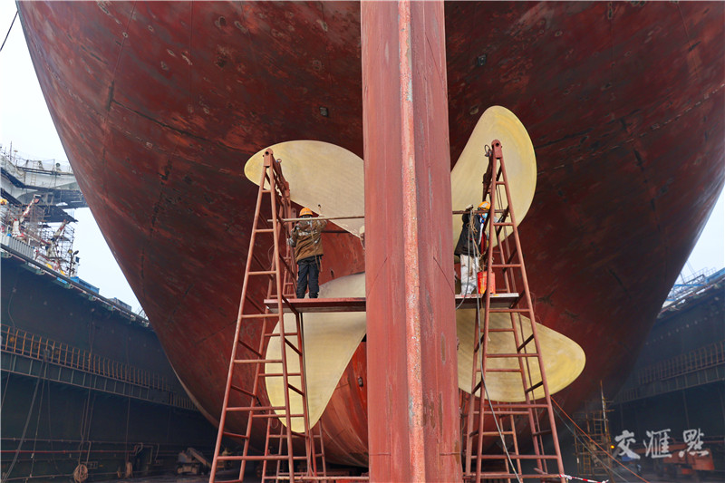 【南通】1月1日,工作人员在南通中远海运船务“南通”号浮船坞内修船现场忙碌,坚守岗位迎新年。许丛军/摄 视觉江苏网供图