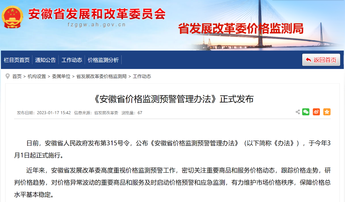 《安徽省价格监测预警管理办法》。图片来源:安徽省发展和改革委员会
