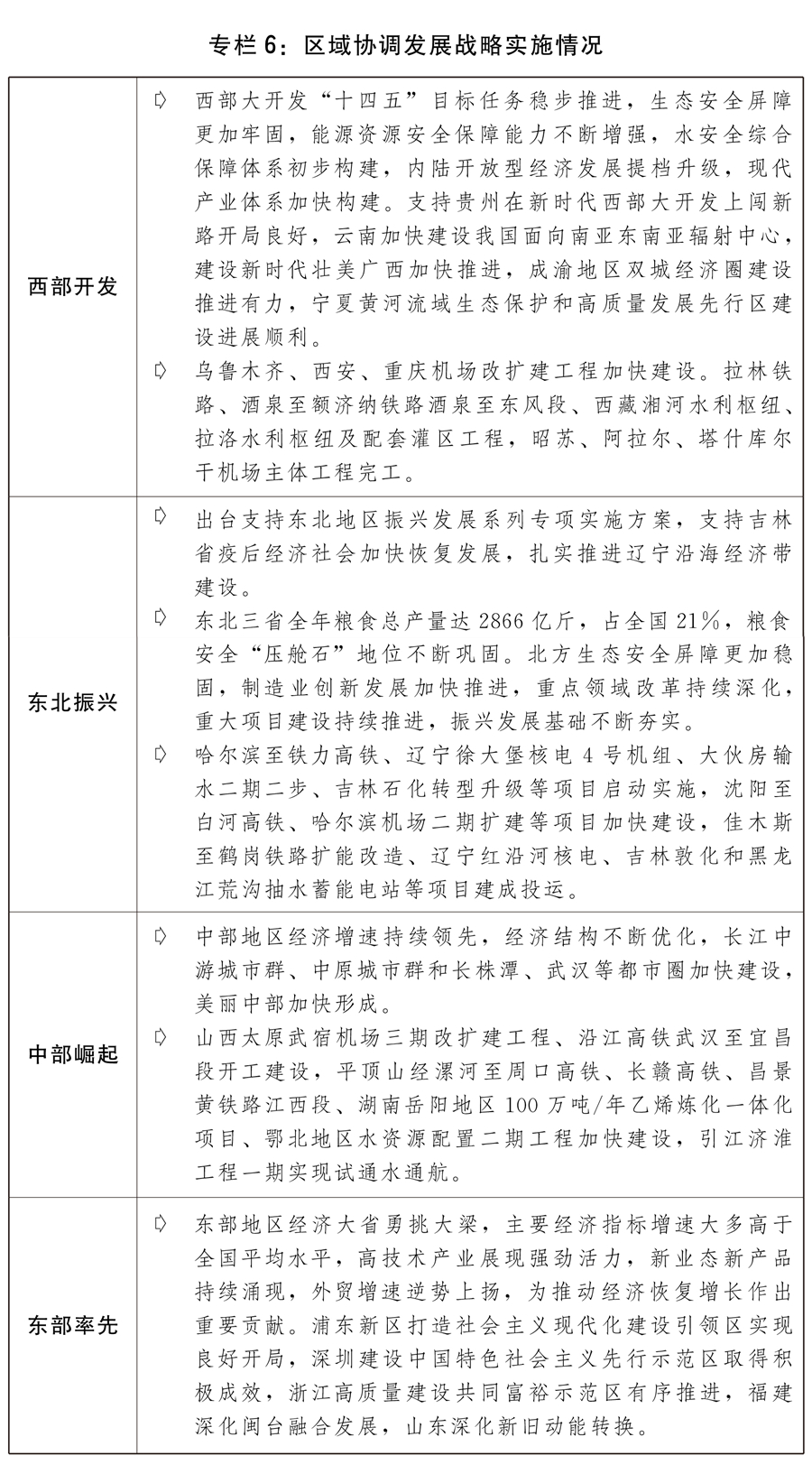 二是区域协调发展战略深入实施。西部地区发展协调性持续提升,400毫米降水线西侧区域保护发展稳步推进。支持东北地区振兴发展系列专项实施方案出台实施,东北地区维护国家粮食安全“压舱石”地位持续巩固。中部地区高质量发展重大工程加快建设,电子信息、新能源等战略性新兴产业集群快速发展。东部地区创新示范带动作用持续发挥。加大特殊类型地区振兴发展支持力度,革命老区振兴发展、资源型地区和老工业城市转型发展取得新进展,边境地区基础设施和城镇建设步伐加快。民族地区经济稳步发展。坚持陆海统筹,加强重点海域综合治理,海洋强国建设加快推进。