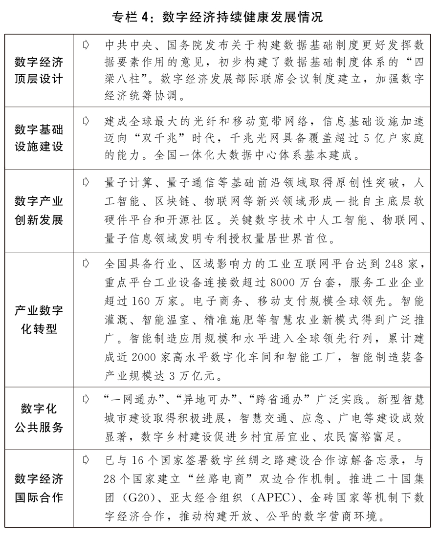 三是数字经济持续健康发展。制定实施构建数据基础制度更好发挥数据要素作用的政策文件,加快完善数据基础制度体系,统筹推进数据确权、流通交易、收益分配、安全治理。数字经济和实体经济深度融合发展,“东数西算”工程全面实施,国家算力网络加快构建,加强对枢纽节点算力基础设施适度超前建设的政策支持,深入推进传统产业、中小企业数字化转型,“上云用数赋智”水平不断提升。信息通信设施加快发展,第五代移动通信(5G)建设全球领先,全年新建5G基站88.7万个,累计建成231.2万个,占全球总数的60%以上。宽带光纤网络加速布局,千兆城市已超过110个。实现平台经济常态化监管,平台经济规范健康持续发展的基础进一步夯实。