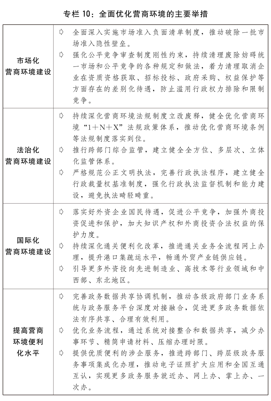 三是营造市场化法治化国际化一流营商环境。深化简政放权、放管结合、优化服务改革。坚持依法行政,严格规范公正文明执法,带头遵守契约,提高政府公信力和执行力。强化公平竞争审查制度刚性约束,持续清理修改不符合优化营商环境条例的规章和规范性文件,推动各地结合实际出台配套政策措施,促进全国范围营商环境持续改善。深化营商环境创新试点,支持有条件的地方率先加大营商环境改革力度。不断优化中国营商环境评价体系,健全中国营商环境评价长效机制。制定进一步提升重点区域、工业园区等营商环境水平的行动方案,推动城市群、都市圈等重点区域营商环境一体化发展。推动建立涉企收费长效监管机制。充分发挥全国一体化政务服务平台“一网通办”枢纽作用,深入推进“一件事一次办”改革举措,加快电子证照应用,持续提升政务服务“跨省通办”质效。建立企业信用状况综合评价体系,强化企业信用风险分类管理,完善社会信用统一代码制度,加强信用信息共享应用,促进中小微企业融资便利。