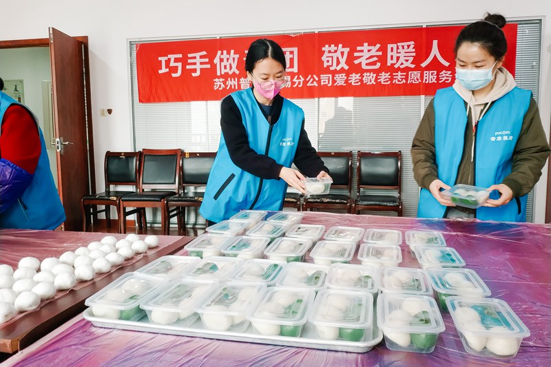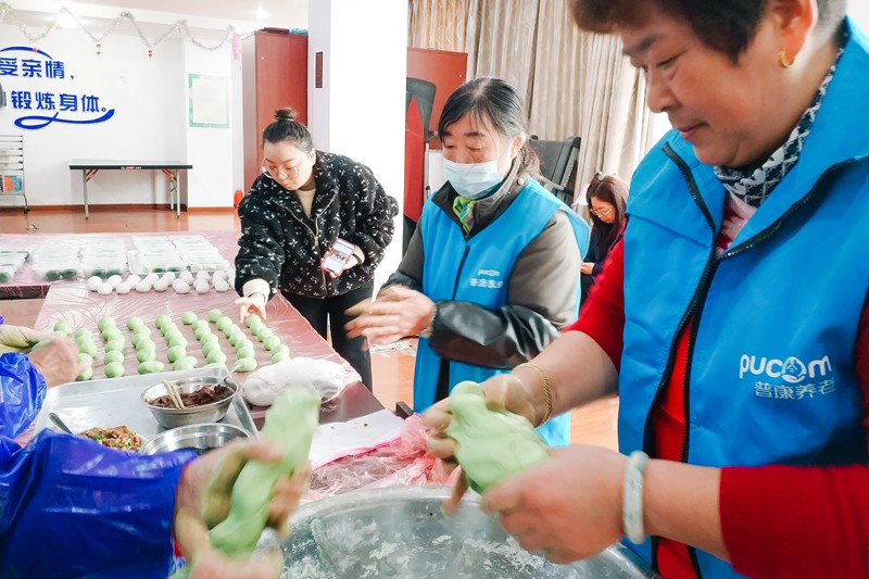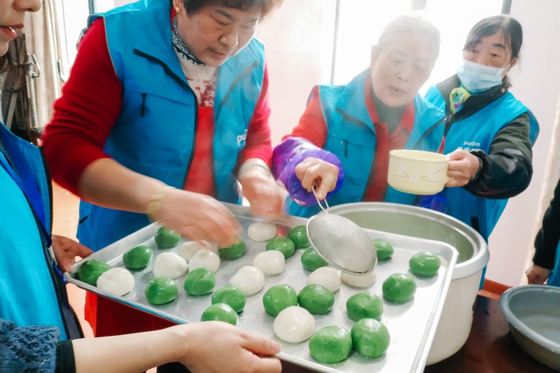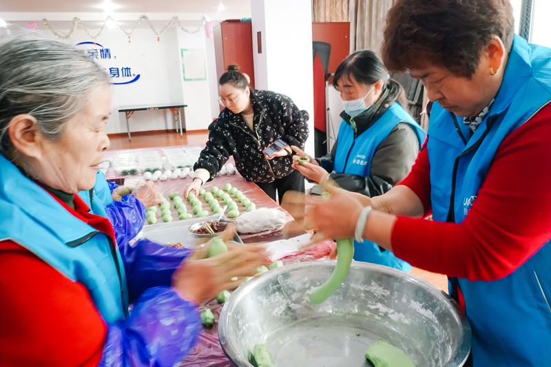 清明至,吃青团。4月2日,锡山区厚桥街道依托普康养老第三方机构,组织社区居民“包青团寄深情”,志愿者们将包好的青团煮熟送给社区老年人品尝,共迎传统节日。(吕枫 摄)