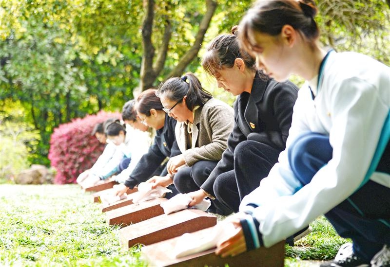 4月4日,无锡市革命烈士陵园,党团员志愿者在擦拭革命烈士的墓碑。