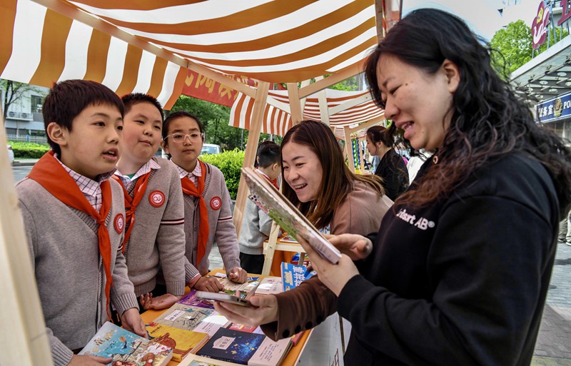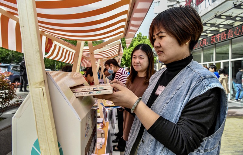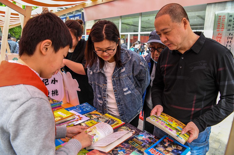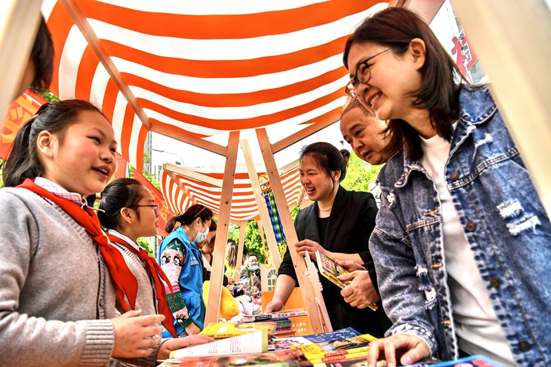 4月14日,黄巷街道五河、龙塘西苑新时代文明服务站和吴桥实验小学以及市交通运输综合行政执法监督局等单位共同举办“捐书义卖暖春日,全民阅读进万家”活动,营造书香社区氛围。(刘芳辉 摄)