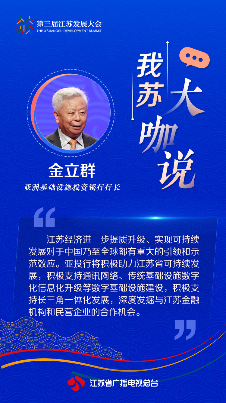 情系江苏、共筑梦想!5月20日上午,第三届江苏发展大会在南京召开,邀请海内外友人共话乡情、共谋发展。在江苏发展论坛上,亚洲基础设施投资银行行长金立群作主旨演讲。