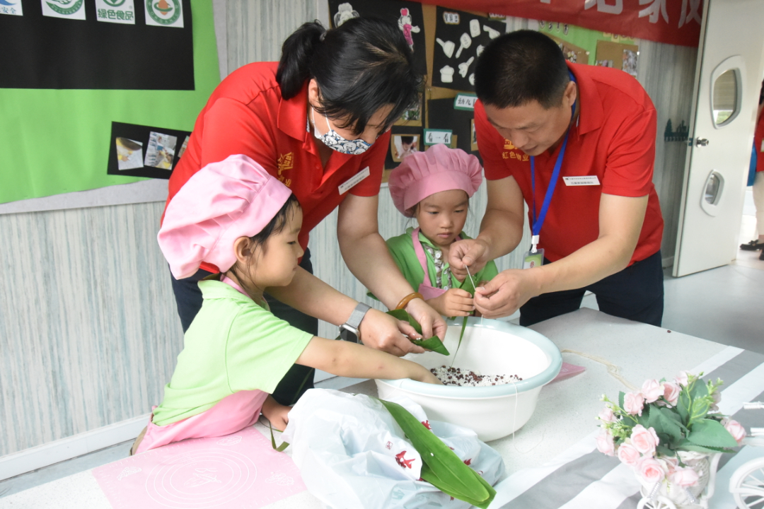 随后,党员志愿者们细心地演示如何包粽子,孩子们在老师的带领下,兴致勃勃地动手学包粽子。叠粽叶、填粽馅、裹粽形、扎粽绳,一双双稚嫩的小手包出一个个形态各异的粽子,通过手把手教孩子们包粽子,让清正廉洁之风代代相传。幼儿们表示,都非常喜欢这个有意义的“六一”活动,让他们不仅学到了很多端午节的知识,也体验到了传统文化的魅力和快乐。