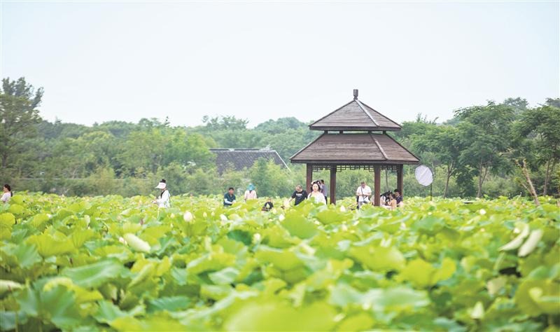 小长假期间,锡城乡村休闲游人气火热,正值荷花初放,不少市民来到荷塘边赏花留影。(宗晓东 摄)