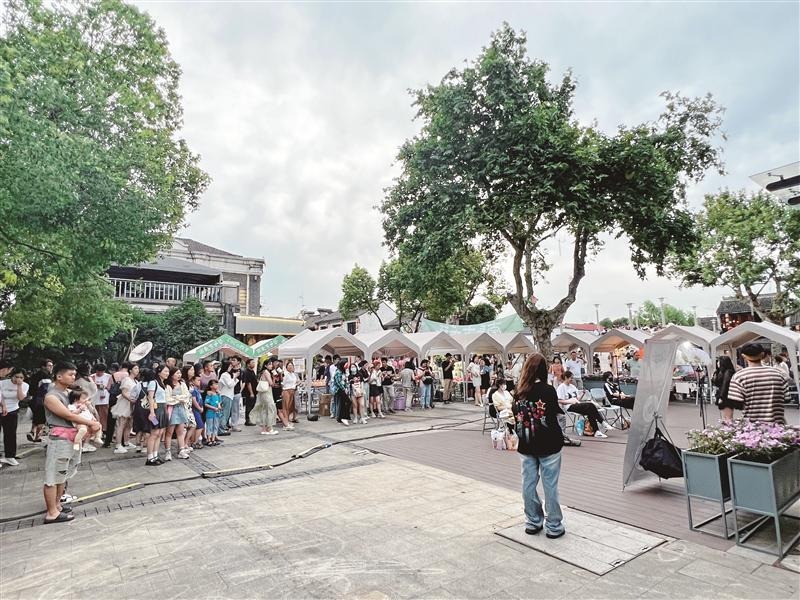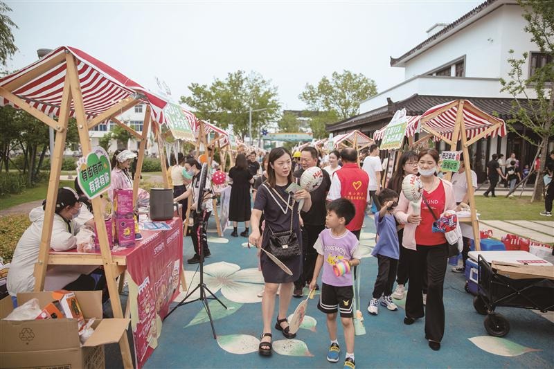 鸿山街道举办的乡村市集人气十足,市民在购买特色产品的同时还体验了端午传统习俗。(宗晓东 摄)