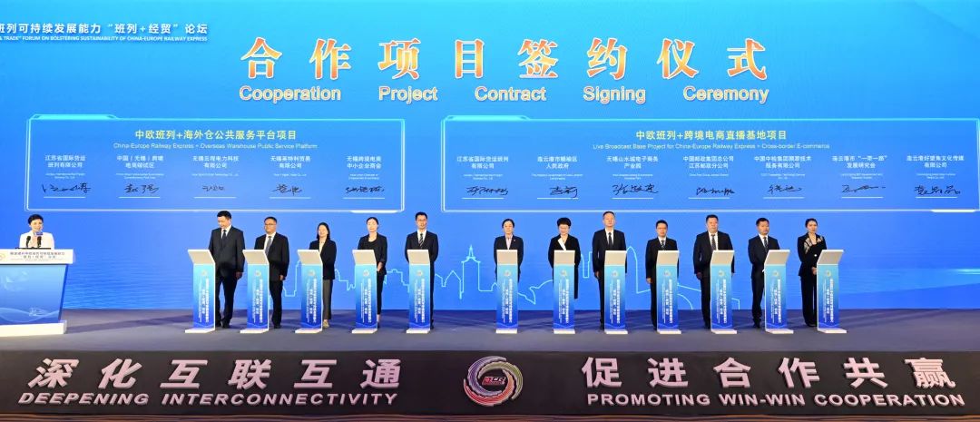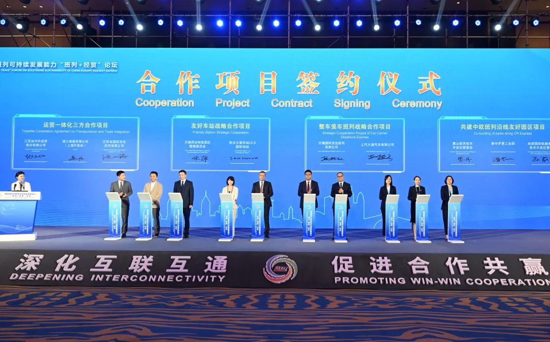 无锡西站物流园区管理委员会与秋古尔塞车站ULS国际场站缔结友好车站,进一步推动运贸融合发展,携手促进两地经济繁荣和社会进步;无锡国际货运班列有限公司与上汽大通签署整车笼车班列战略合作项目协议,依托这一定制专列,将实现货物全程运输时间由纯海运60多天缩短至25天左右,大幅节省物流成本,提升运输效率;江苏省对外经贸股份有限公司、瑞士泰扈有限公司(上海代表处)、省国际货运班列有限公司签署运贸一体化三方合作项目协议,在矿产贸易、物流运输等多领域开展战略合作,打造“运贸一体化”发展合作典范;惠山经济技术开发区、泰中罗勇工业园、成都国际铁路港经济技术开发区共建中欧班列沿线友好园区,推进物流节点设施和物流公共信息平台共建共享。