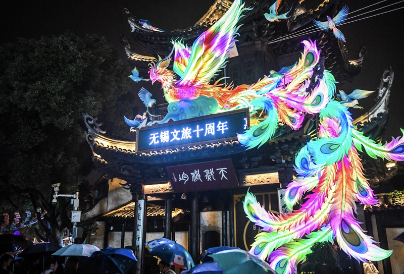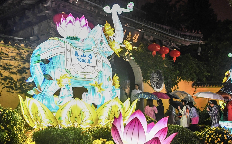 以灯为媒,营造中秋、国庆美好氛围。目前,惠山古镇景区已在绣嶂阁、古迹区门口分别布置了《百鸟朝凤》《太平有象》两组灯展造型,突出喜迎国庆氛围。诗词投影枝头,巨型月亮灯浮现水面……寄畅园结合现代化声光电等多媒体元素,点亮古典园林的中秋、国庆夜。
