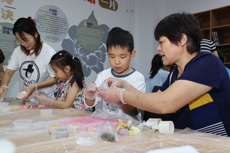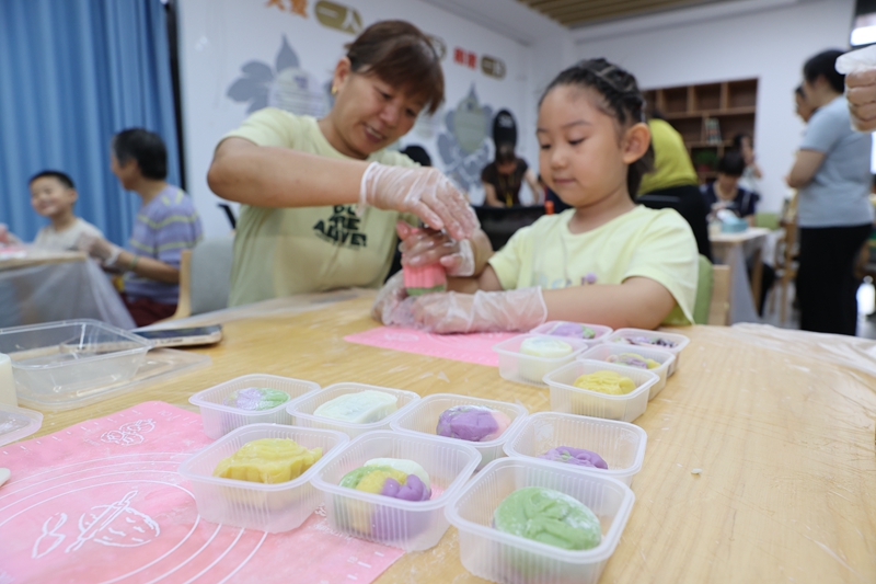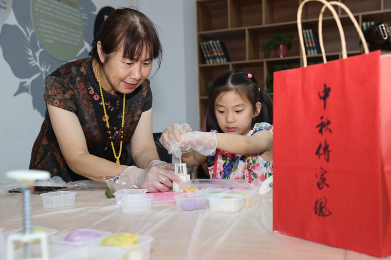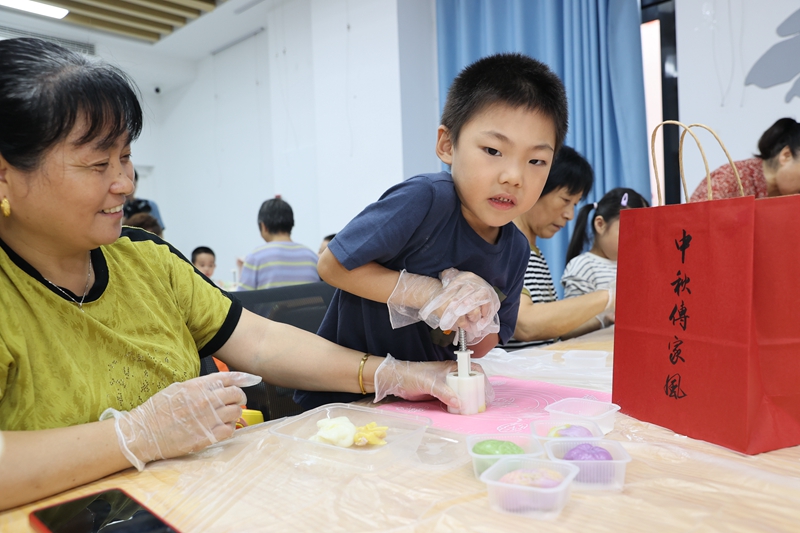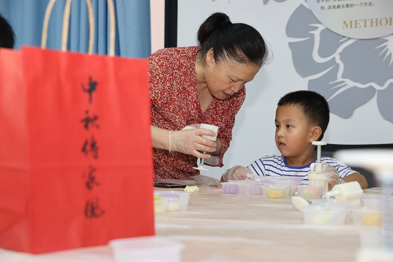 近日,梁溪区广益街道银仁社区举办“中秋传家风 老少同欢乐”主题活动,辖区老少联手制作中秋月饼、书写家风礼袋、讲述中秋文化,并与社区网格员一起将手工月饼赠送给困难家庭,共度和美的中秋佳节。(朱吉鹏 摄)