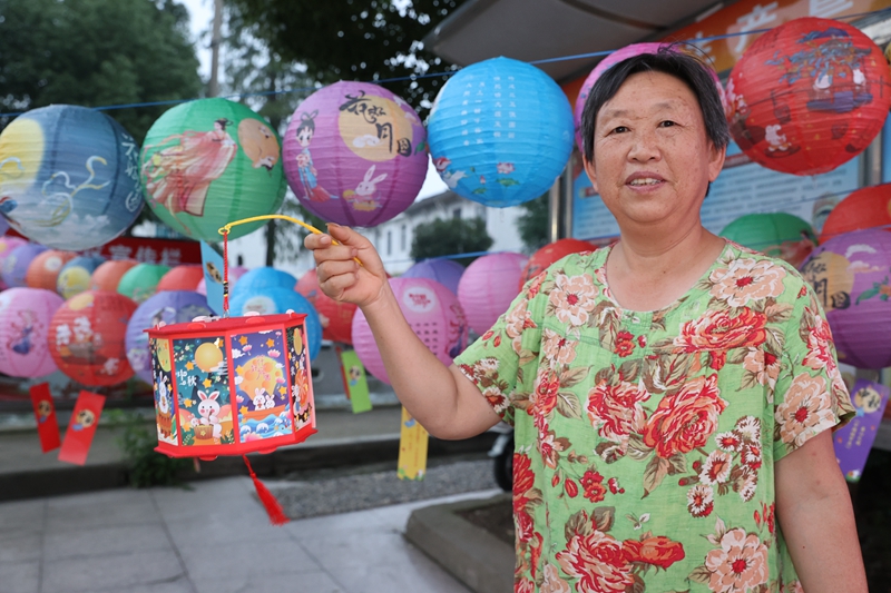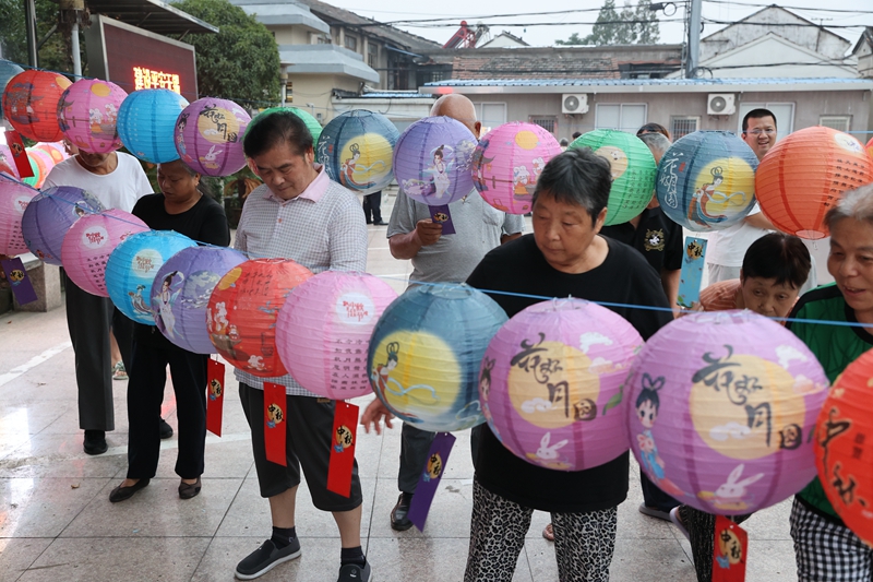 近日,梁溪区瞻江街道前村社区举办中秋游园会,老村巷居民欢聚一堂,猜灯谜、制花灯、看电影、滚铁环、做月饼……通过一个个传统游戏互动环节,拉进邻里关系,欢度中秋佳节。(朱吉鹏 摄)
