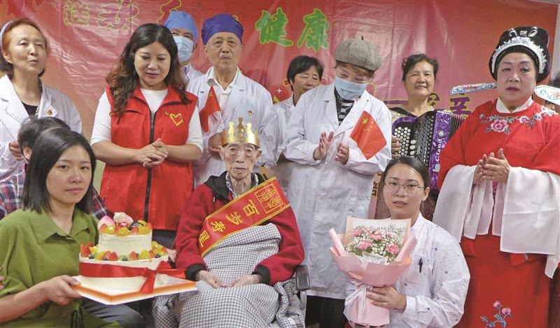 10月17日,无锡市军休中心惠龙服务站、梁溪区爱飞翔公益服务社、黄巷街道广石家园社区的志愿者来到康惠龙塘护理院,共同为百岁老人王婉春送去重阳节的祝福。(许伟文 摄)