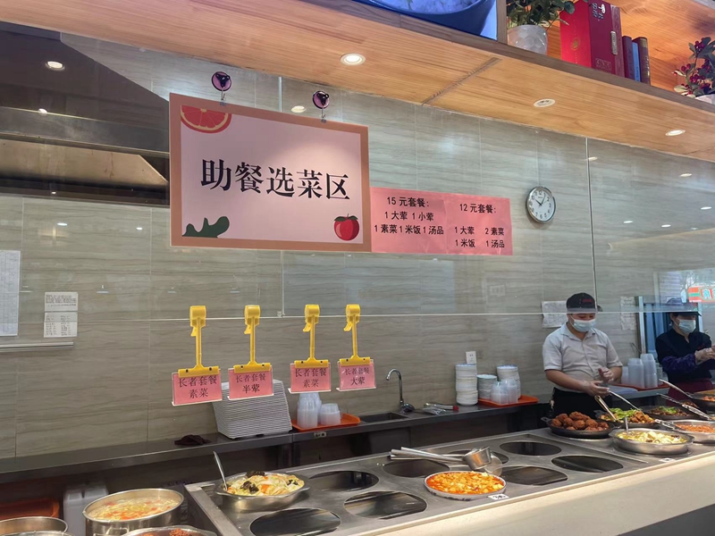 当天上午,梁溪区在扬名街道阳光城市花园社区试点的混合运用模式“长者助餐中心”正式启用(如图),不一会儿,位于阳光广场的店堂内就已经坐得满满当当。记者看到,餐厅内各色菜式荤素搭配、色香味俱全,老年人专门的就餐区域干净整洁,橙绿色的布置也充满了活力。选餐区菜品码放整齐,后厨还在继续完成烹饪。“助餐中心的菜单和设置,是社区与负责运行的商家在吸纳了辖区老人意见后配置而成。”餐厅店长告诉记者,设置了12元、15元两种套餐,价格只有市场价的一半。60周岁以上老人预先登记、持卡消费,就能用优惠价格享受老年套餐。助餐中心内也会定期更换老年人餐单,公示助餐服务时间、套餐价格、食品安全承诺书、健康证、举报电话等信息。阳光城市花园社区内则实行“中心+站点”助餐服务,社区因地制宜地将阳光城市花园C区51号居家养老服务站建设成助餐配送点。构造“社区食堂+餐饮企业”“定点用餐+助餐配送”的老年助餐服务模式。社区内的这个配送点内,也设置了可供三四十人就餐的座位,每天由中心送餐到站点,方便老年人就近用餐。