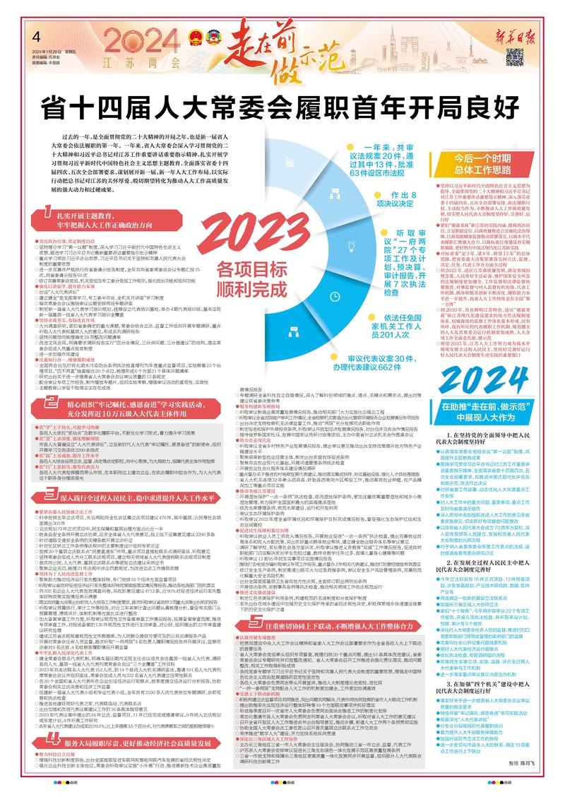 ●紧扣“强富美高”新江苏的实践内涵,提高政治站位,立足职能定位,以高质量推进立法强化法治保障,以高效能精准监督推动部署落实,以高水平代表履职汇聚强大合力,以高标准自身建设夯实履职基础,更好助力中国式现代化江苏新实践