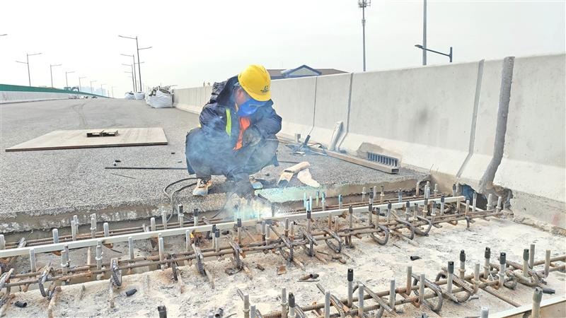 “一条伸缩缝需要四到五个小时才能焊接完成。”有多年电焊工作经验的乔明告诉记者,钢筋焊接是伸缩缝施工的基础工序,也是桥面下的隐蔽工程,焊接结束经过监理验收,才能浇筑混凝土。浇混凝土时,电焊组的工人在现场帮忙打下手,直到伸缩缝整体做完方能离场。“伸缩缝做得好,将来通车后汽车驾驶体验舒畅,不会感觉‘跳车’。”
